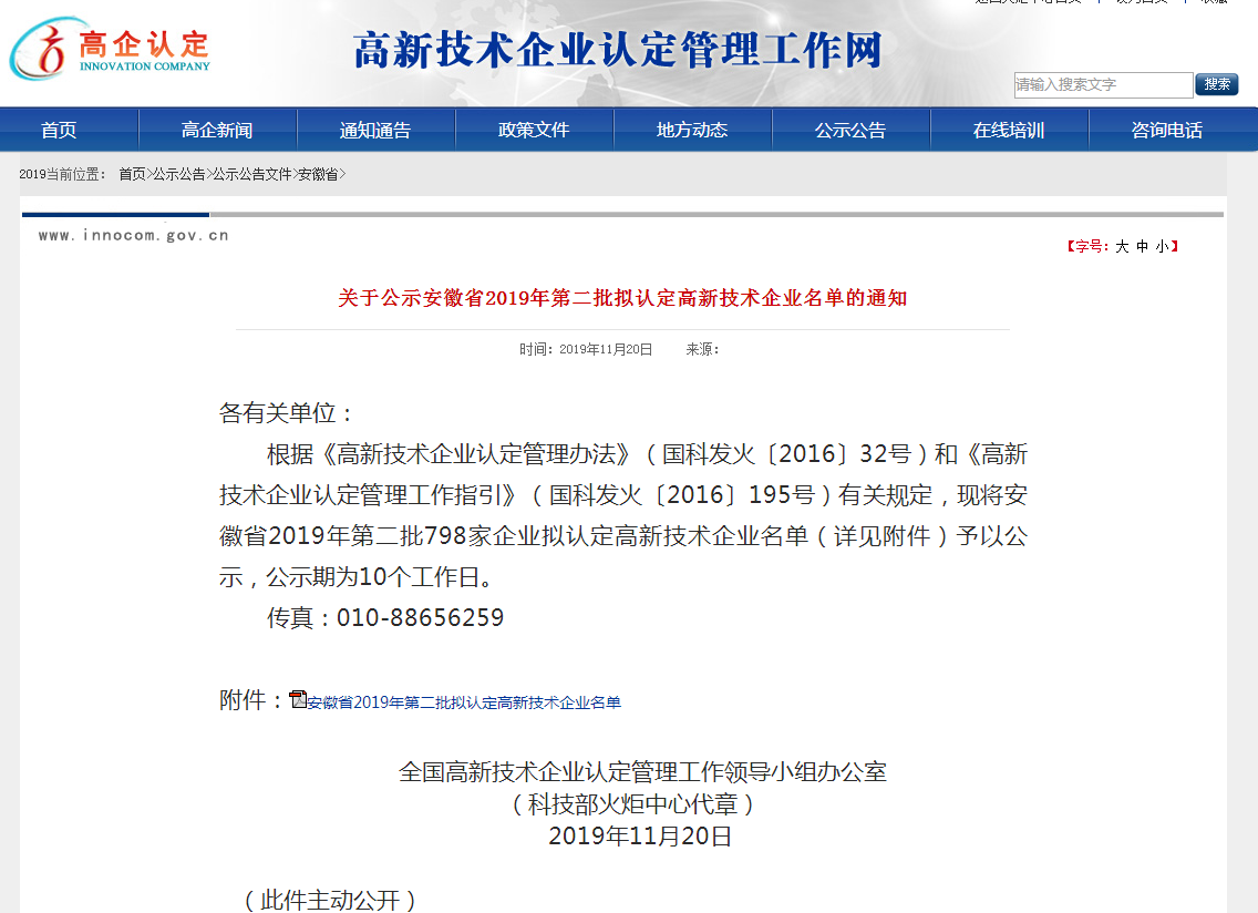 2019年11月20日,国家科学技术部火炬中心发布了《关于公示安徽省2019年第二批拟认定高新技术企业名单的通知》,安徽腾博会官网机电科技开展有限公司迁址合肥市经开区后,继续被认定为高新技术企业!