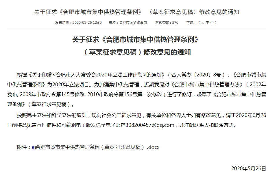 合肥市城市集中供热管理条例(草案 征求意见稿)