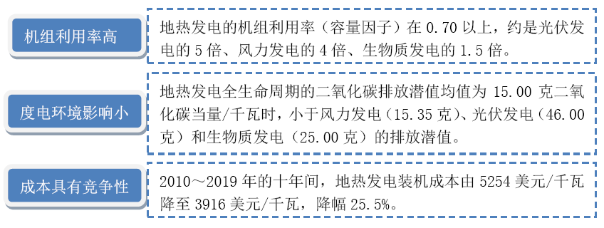 地热发电是地热能利用的重要方式。与其他可再生能源发电技术相比,地热发电的机组利用率高、度电环境影响小、成本具有竞争性(见图5),且不受天气条件的影响,可给予基荷电力。
