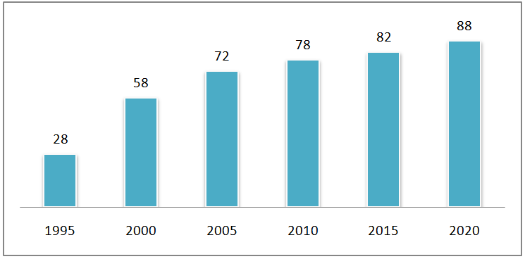 地热直接利用包括供热、制冷、烘干、温泉洗浴等。近年来,全球直接利用地热能的国家数量不断增加。根据2020年世界地热大会的统计,2020年直接利用地热能的国家/地区已从1995年的28个增至88个(见图2)。