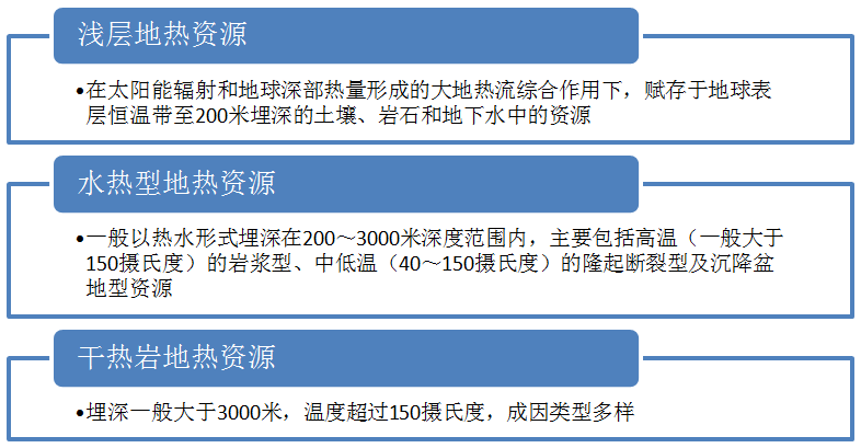 按照空间分布和赋存状态,地热资源可以分为浅层地热资源、水热型地热资源、干热岩地热资源。其中,水热型地热资源又分为高温和中低温地热资源(见图1)。不同类型地热资源利用可分为直接利用和发电利用两类。