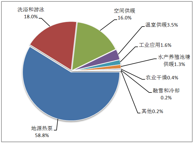按类别划分,地源热泵是全球地热直接利用最主要的方式,地源热泵供热制冷,主要分布在北美、北欧和中国等地区,到2020年地热能利用量占比约为58.8%。温泉康养方面,包括洗浴、游泳、娱乐等,具有很高的附加值,虽然没有政府的主动有助于,却不断在自发地迅速开展,地热能利用量占比约为18%。空间供暖(其中绝大部分是区域供暖)的地热能利用量约占16%,主要集中在中国、冰岛、土耳其、法国、德国等国。此外,温室供暖的地热能利用量约占3.5%,工业应用约占1.6%,水产养殖池塘供暖约占1.3%,农业干燥占0.4%,融雪和冷却占0.2%,其他方面占0.2%(见图4)。
