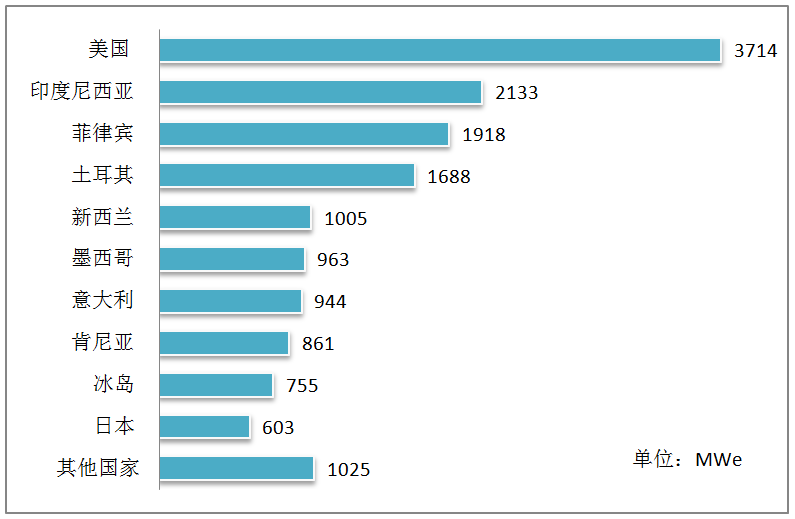 在2020年疫情冲击下,地热发电增长受到一定影响。根据ThinkGeoEnergy数据,2020年全年全球新增地热发电装机容量202兆瓦,其中土耳其新增168兆瓦,贡献了绝大部分的装机增量。截至2020年底,全球地热发电装机达到15608兆瓦。其中,美国地热发电装机3714兆瓦,居世界首位,其次是印度尼西亚、菲律宾、土耳其和新西兰。地热发电装机排名前十的国家占到全球地热发电装机总量的90%以上(见图7)。